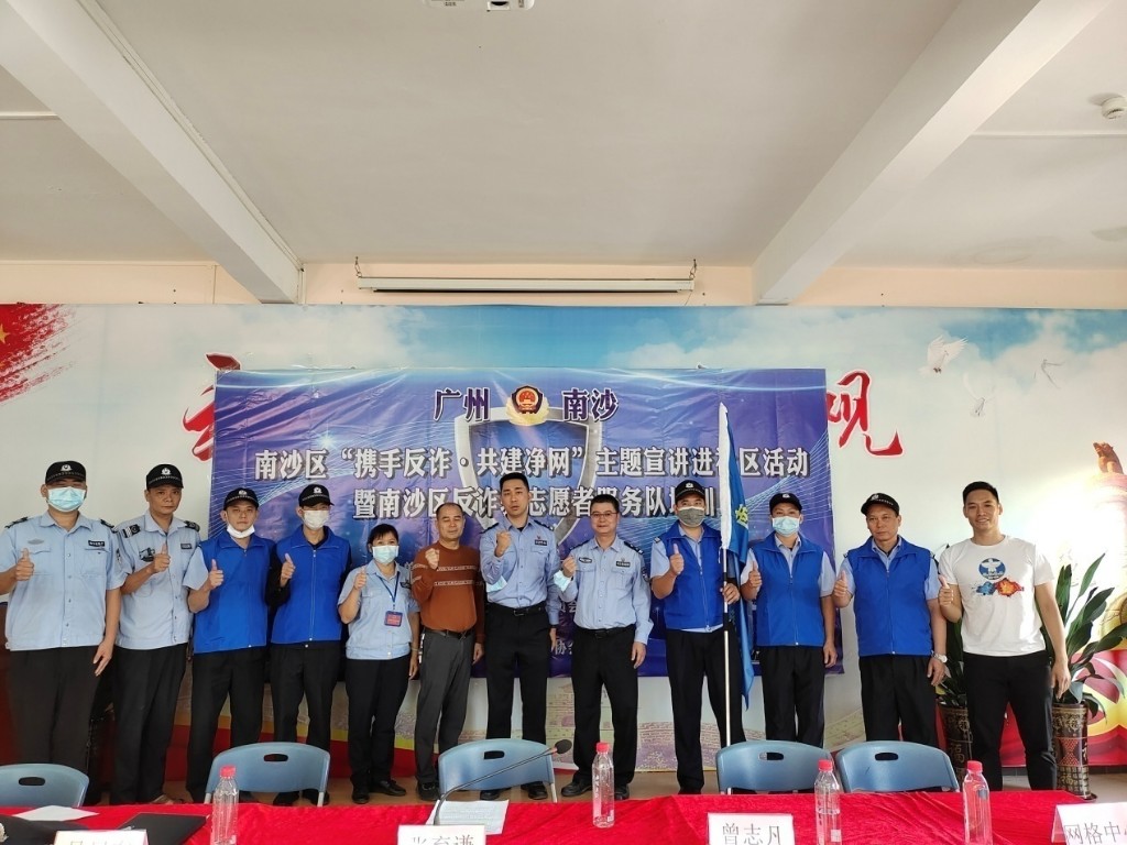 活动最后,张育谦与分局鱼窝头派出所副所长易日东共同为南沙区反诈骗志愿者服务队授旗。