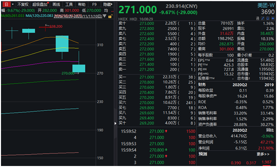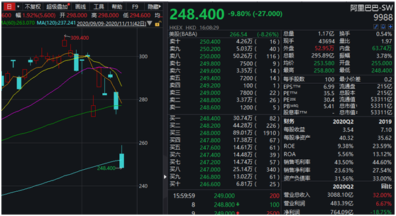 昨夜,“双11”战报新鲜出炉!2020天猫双11全球狂欢季期间的成交额突破4982亿元(从11月1日开始计算)。记者注意到,不仅电商商品迎来打折促销,昨日阿里、京东在内等电商巨头股价纷纷大跌,多只科技股股价也大幅“打折”,其中,阿里巴巴下跌9.80%,京东集团港股下跌9.2%,美团再度重挫9.67%。