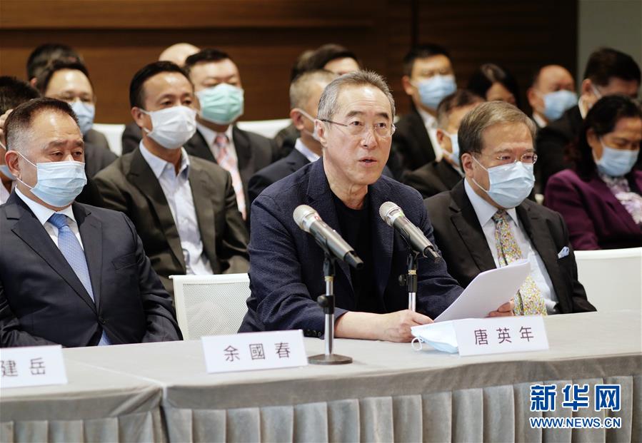 11月13日,在香港中環廣場,全國政協常委、香港友好協進會會長唐英年(中)與多位港區全國政協委員舉行新聞發佈會,表示堅決擁護和支持全國人大常委會就香港立法會議員資格問題作出的決定。新華社記者 王申 攝