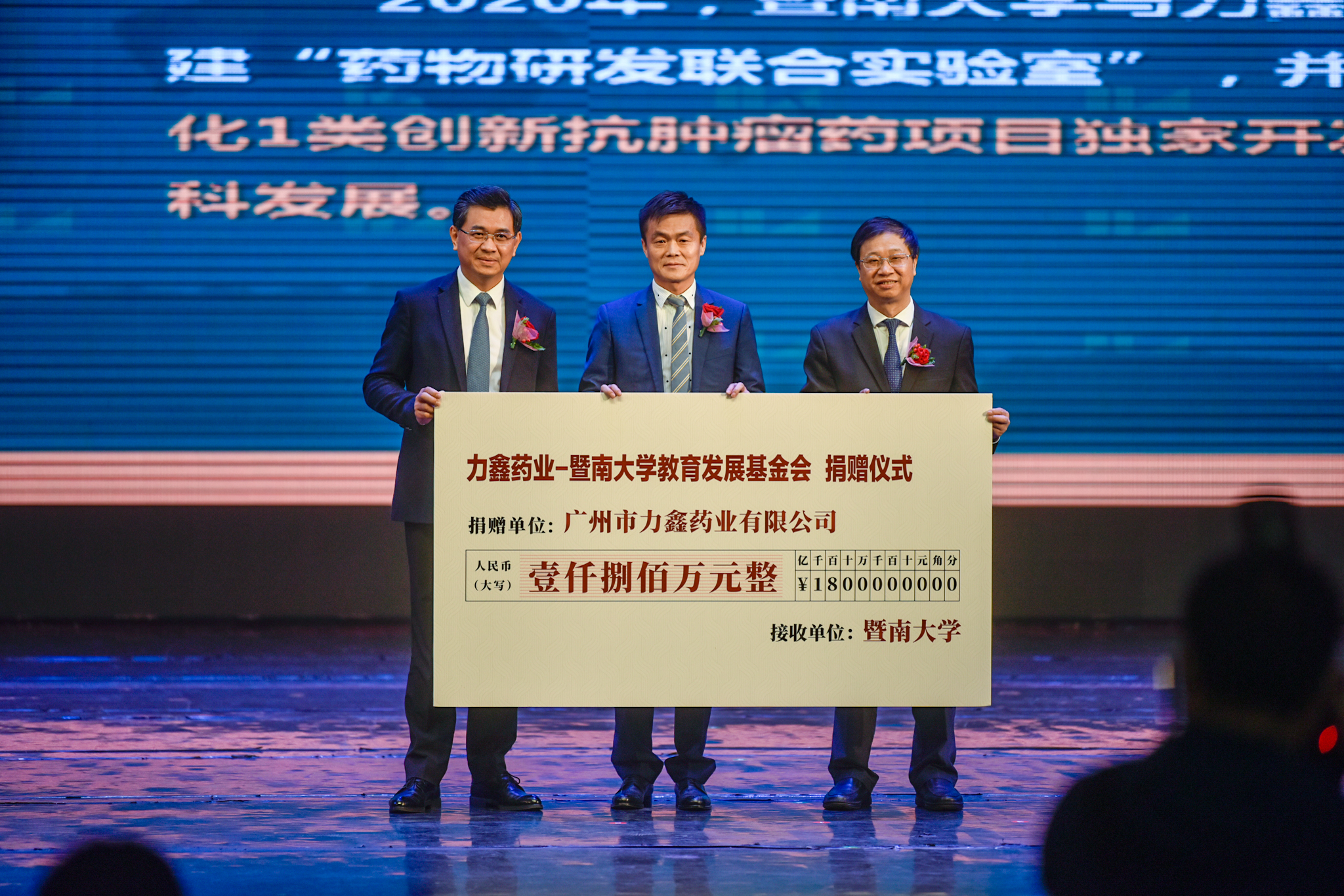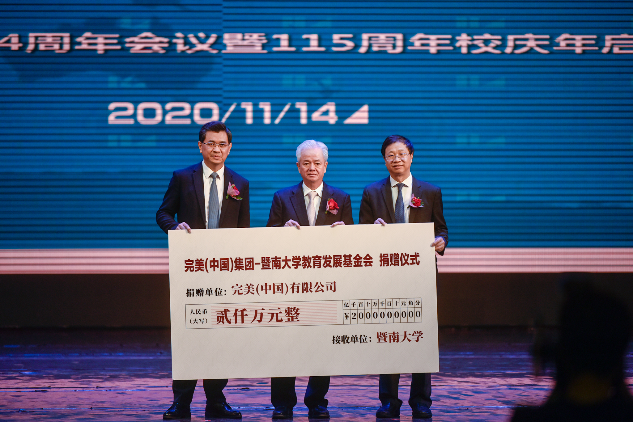 完美(中国)有限公司古润金校董捐赠2000万元(累计捐赠逾5180万);合景泰富集团控股有限公司孔健岷校董捐赠2000万元(累计捐赠逾5000万元);广州力鑫药业有限公司高悦译校友捐赠1800万元;广东弘迅投资集团张毅校友捐赠1000万元(累计捐赠逾2000万);上海远赞生命科学有限公司彭德镇先生捐赠1000万元;广东科康医疗集团郑银土先生捐赠800万元(累计捐赠逾1132万);香港各界文化促进会主席涂辉龙先生捐赠400万元;广州华域资产管理有限公司捐赠300万元;广州恒德建材董事长唐小梅女士捐赠200万元;佳兆业集团控股有限公司捐赠200万元;民生银行捐赠200万;广州纳金科技有限公司董事长刘健明校友捐赠100万元;方贤赟校友、马莉校友伉俪捐赠100万元;加拿大多元文化交流协会会长黄锦华先生捐赠100万。
