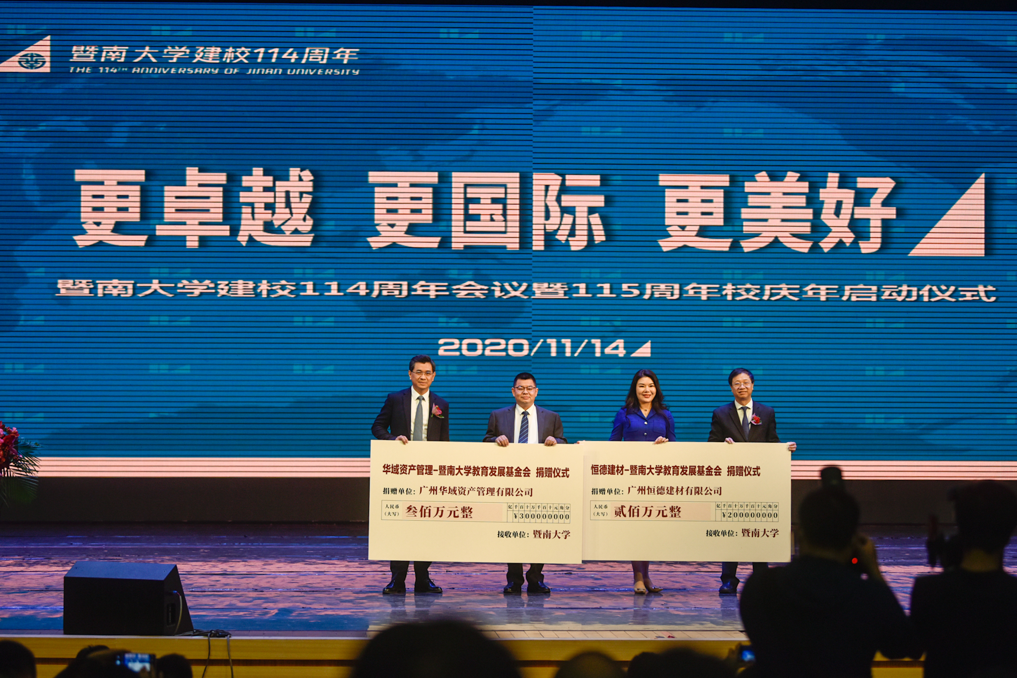11月14日下午,暨南大学建校114周年纪念会议暨115周年校庆年启动仪式在暨南大学大礼堂举行。会上,发布了暨南大学建校115周年校庆标识,160位优秀学子获社会类奖助学金。记者了解到,2021至2025年,暨南大学将争取10个亿的社会支持。校庆期间,暨南大学共收到“筹款行动计划”首批集体捐赠,捐赠金额共计1.02亿元,现场举行了捐赠仪式。