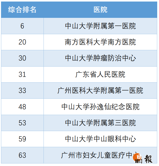 今年广东和去年一样,共有9家医院进入全国综合百强名单。中山大学附属第一医院仍是“华南龙头”,位居全国第六,入选前五十名的广东医院还有南方医科大学南方医院、中山大学肿瘤防治中心、广东省人民医院、广州医科大学附属第一医院、中山大学孙逸仙纪念医院。中山大学附属第三医院、中山大学中山眼科中心、广州市妇女儿童医疗中心也进入了前100名。