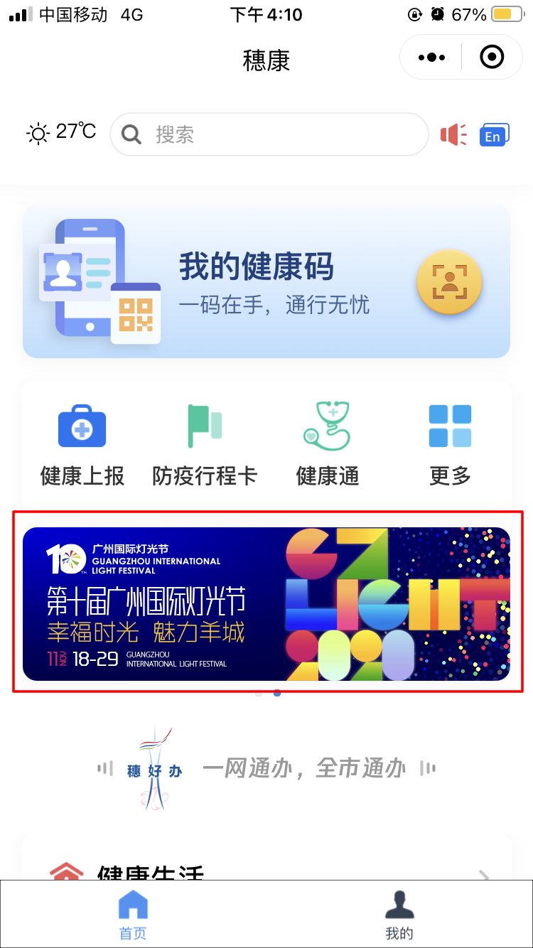 一、点击微信小程序,搜索“穗康”,进入后点击“广州国际灯光节预约入口”,跳转至预约界面;