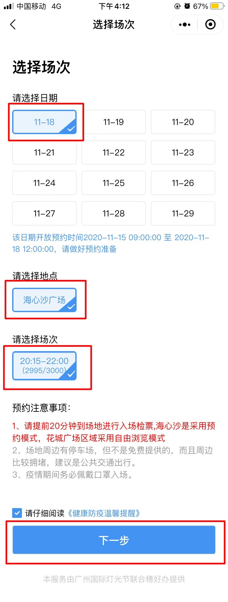 海心沙预约规则:11月15日上午9时至18日中午12时前可预约18日门票,之后采取逐日开放预约形式,预约开放时间为前一天的12:00(即11月18日中午12:00后开放19日预约,19日中午12:00后开放20日预约,以此类推)。