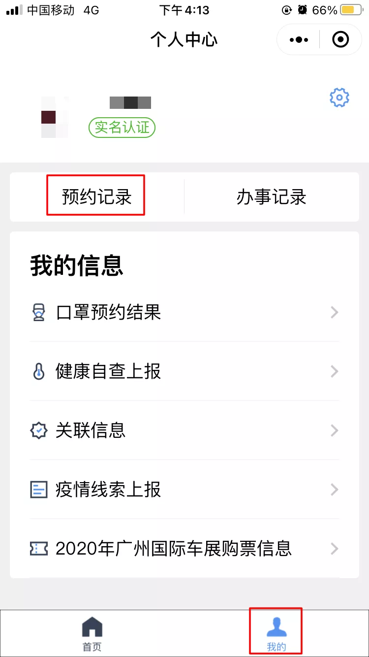 五、查询预约订单详情,进去“穗康”小程序后,点击右下角“我的”按钮后,点击“预约记录”,即可查看预约订单详情。