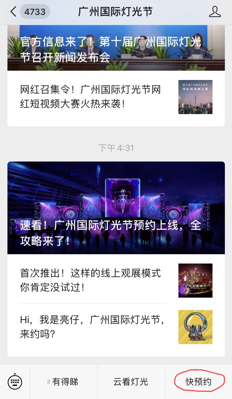 一、关注“广州国际灯光节”微信服务号,在对话界面右下角,点击“快预约”按钮,跳转至“穗康码小程序”;