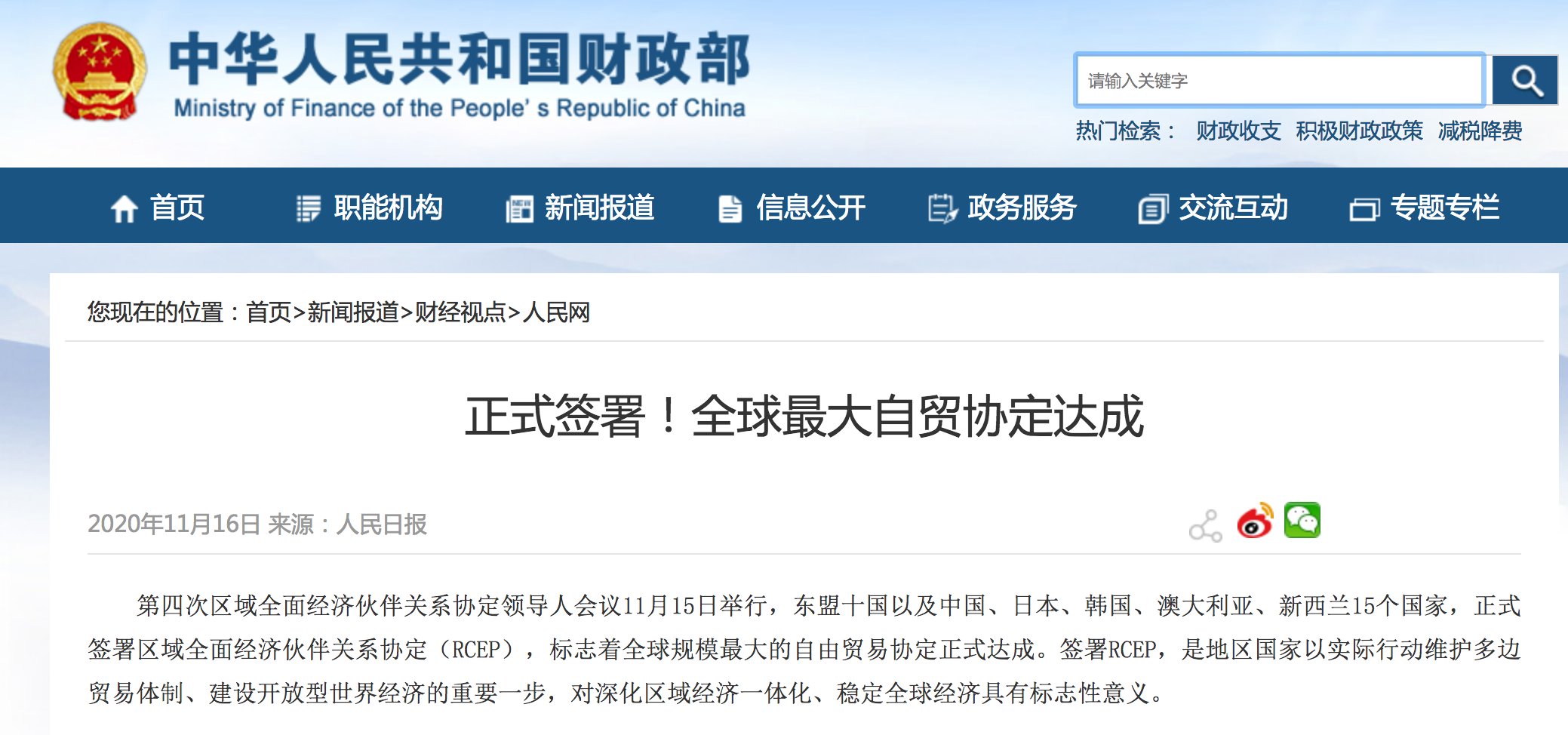 根据人民日报报道,第四次区域全面经济伙伴关系协定领导人会议11月15日举行,东盟十国以及中国、日本、韩国、澳大利亚、新西兰15个国家,正式签署区域全面经济伙伴关系协定(RCEP),标志着全球规模最大的自由贸易协定正式达成。签署RCEP,是地区国家以实际行动维护多边贸易体制、建设开放型世界经济的重要一步,对深化区域经济一体化、稳定全球经济具有标志性意义。