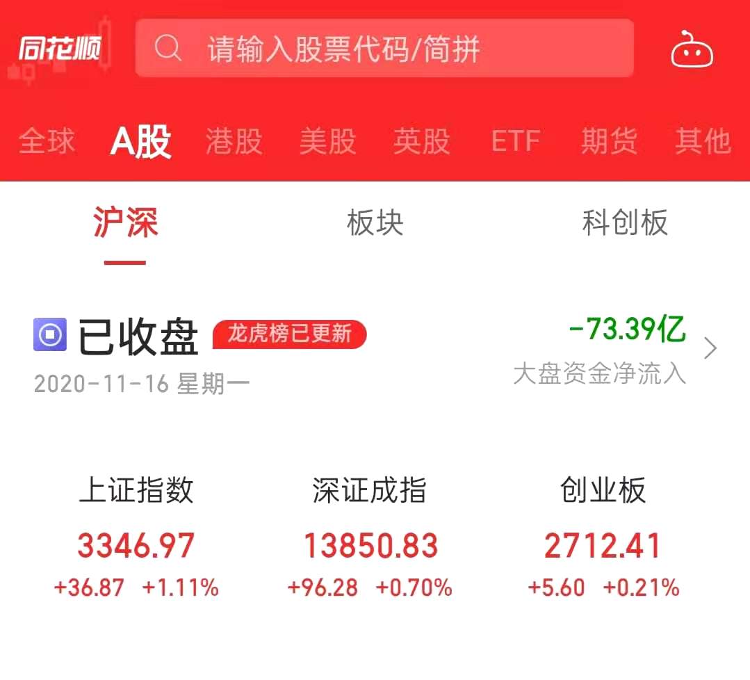 11月16日星期一,截至收盘,上证指数涨1.11%,报3346.97点,深证成指涨0.70%,报13850.83点,创业板指涨0.21%,报2712.41点。