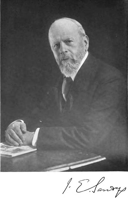 约翰·埃德温·桑兹(John Edwin Sandys,1844-1922),英国古典学者,剑桥大学圣约翰学院研究员、导师,剑桥大学校方发言人,不列颠学会会员。曾获都柏林(三一学院)、爱丁堡、雅典、牛津几所大学荣誉博士学位,剑桥大学“终身荣誉发言人”的称号,被希腊最高荣誉级别组织“救世主勋章团”授予司令官徽章。1911年获爵士头衔。