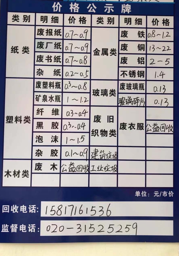 今日上午,记者来到位于黄石街保利路7号的黄石街再生资源中心,门口墙壁上,一张价格公示牌上清楚地显示了各类废品明细和对应回收价格。