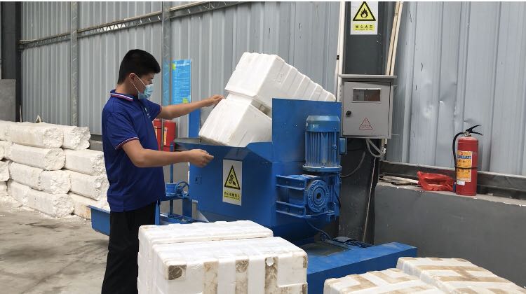 该中心的作业区占地1800平方米,被划分为废金属、废家电、废铁、废纸、废泡沫、废塑料、废木材、工业垃圾、大件物、建筑垃圾、废衣服共11个区域。在废泡沫区,一台泡沫压缩机正将回收来的废泡沫粉碎、压缩成一个个长方体,方便运输。