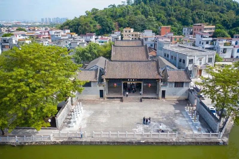在航拍镜头中,玉带河犹如一条“绿腰带”,岸边树木绿葱葱,河水静静流淌。长约900米的玉带河,环绕菩山东南面,与里巷的小埠项链,形成典型的岭南水乡格局,正是“菩山环座后,玉带绕门前”,一条玉带河串起大岭村的文化景观,石桥、麻石巷、祠堂、门楼、牌坊、古树、蚝壳墙……岭南水乡的风韵在这里随处可见。
