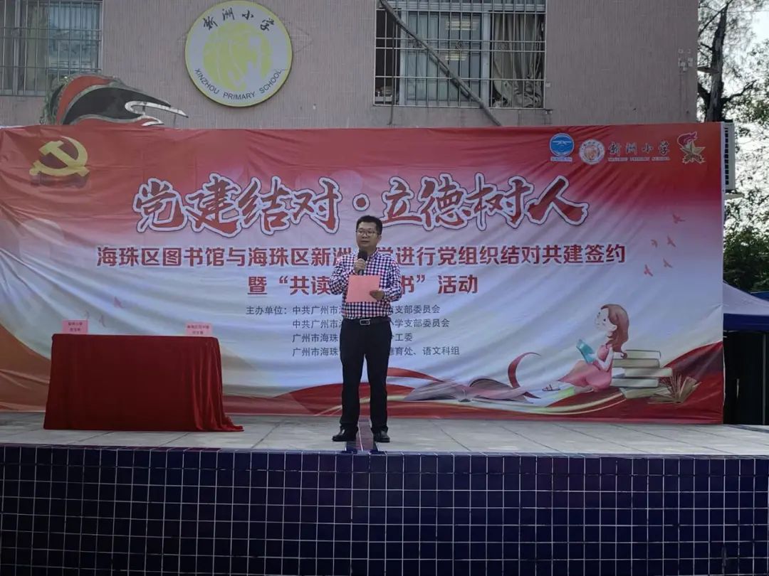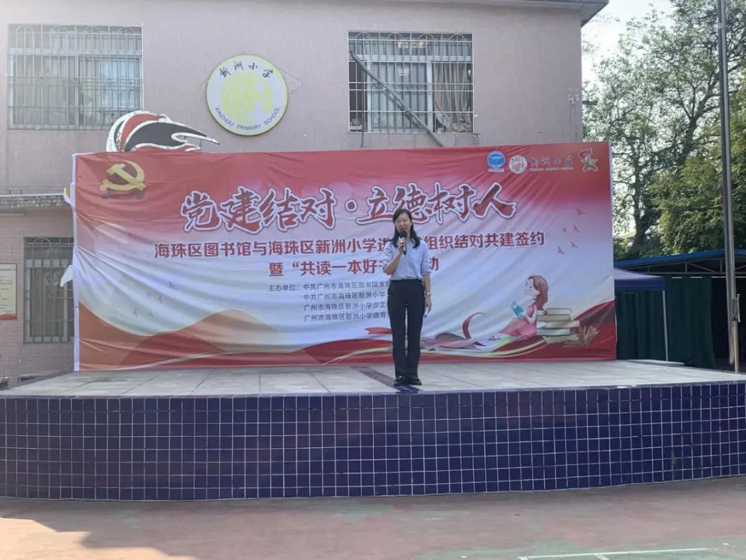 林道英在致辞中表示,感谢海珠区图书馆为新洲小学全体师生提供了非常优质的阅读资源,希望师生珍惜书籍、养成“好读书、读好书、善读书”的习惯。同时,林道英强调了本次活动对于加强党组织建设,全面提升党建工作水平,以及推进海珠区全民阅读工作的重要意义。
