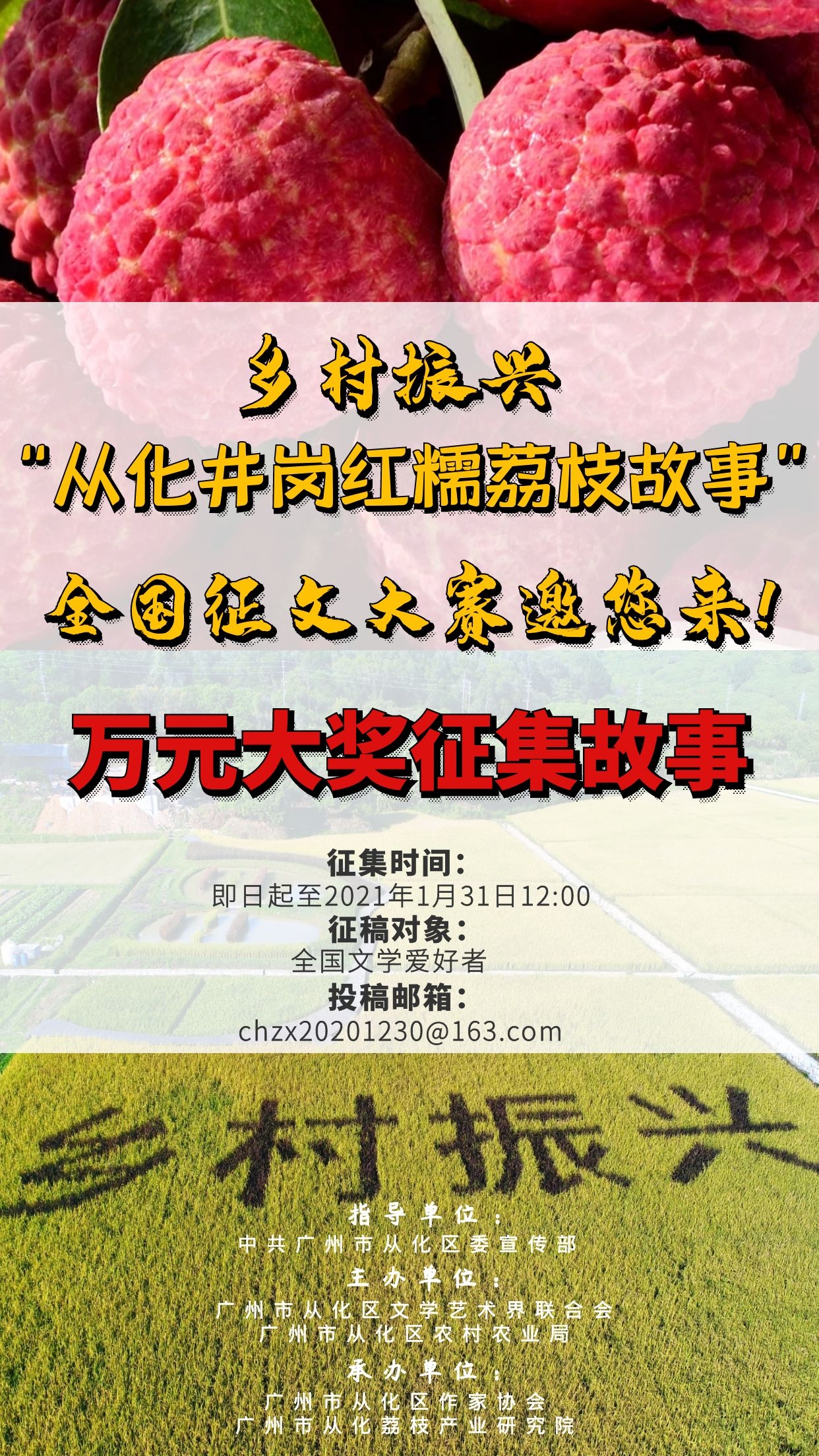 你了解世界荔枝之乡从化的井岗红糯荔枝故事吗?为进一步弘扬红色文化,激发乡村文化活力,讲好从化乡村振兴故事,即日起,从化区向全国文学爱好者发出征文邀请,邀请全国的文学爱好者参与乡村振兴“从化井岗红糯荔枝故事”全国征文大赛。此次大赛由从化区委宣传部指导,从化区文联、从化区农业农村局主办,从化区作家协会、从化荔枝产业研究院等承办。据悉,这也是近年来从化区举办的首次全国征文大赛。