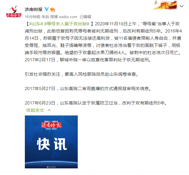 2020年11月18日上午,“辱母案”当事人于欢减刑出狱,此前他曾因刺死辱母者被判无期徒刑,后改判有期徒刑5年。2016年4月14日,苏银霞于欢母子因无法偿还高利贷,被11名催债者限制人身自由,并遭受辱骂、抽耳光、鞋子捂嘴等凌辱,讨债者杜志浩当着于欢的面脱下裤子,用极端手段污辱苏银霞。绝望的于欢拿起水果刀捅伤4人。被刺中的杜志浩次日死亡。2017年2月17日,聊城中院一审以故意伤害罪判处于欢无期徒刑。