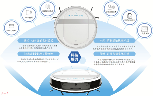 通过高清摄像头,目前在广州研发的产品空间感知能力已经精确到毫米级。王立磊介绍,通过人工智能跟大数据的学习,他们现在的扫地机器人已经不是乱跑乱撞的机器人了,并可同步识别7种不同类型的垃圾,连女士长长的头发都能通过滚吸互换的方式进行清理。