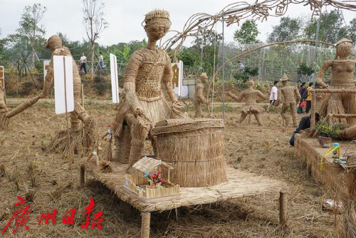 此次艺术节的稻草作品取材于从化本地,同时展现了本地的文化生活。太平镇水南小学则以从化本地的赶集为主题制作了稻草造型;上塘小学的稻草作品创作灵感来自于学校的跳绳特色;此外,还有体现从化地方文化的灵秀坊与广裕祠;有体现乡村特色的稻草风车、打糍粑……