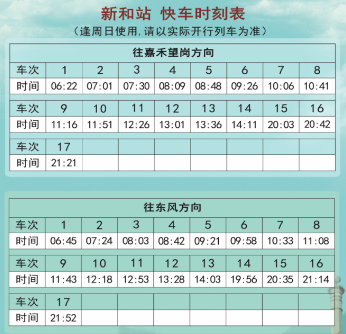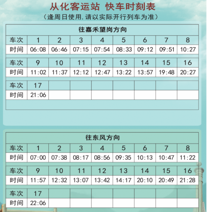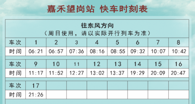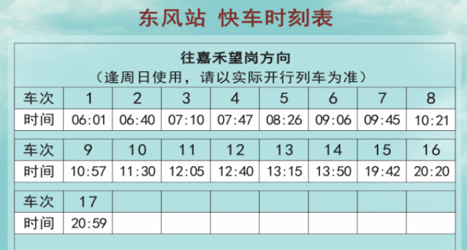 3、快车时刻表仅作为参考,搭乘时请以现场为准。
