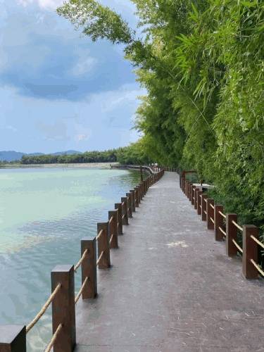 韶关市环丹霞山碧道起于丹霞街道车湾村,沿锦江一级支流董塘河,直至锦江河旅游项目水上竹筏码头上游约350米处夏富镇江司处,碧道规划全长6.4km,漫步道总长6.89公里,工程建成后将沿途4条特色景观带、7个特色景点串珠成链。包括丹山霞影、锦水绣韵、纯乡寄情和竹林游旅组团,通过水路双游径串联丹霞印象、临溪竹筏、日出丹霞、古村拾光、夕照青山、竹林魅影、凤尾绿洲等特色资源,是广东万里碧道中最具丹霞特色的自然生态型碧道。目前,全线已开放入使用。