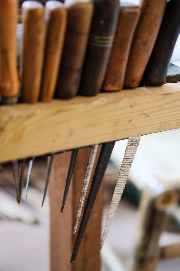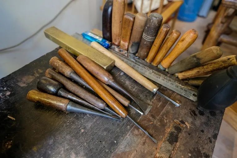 工作室入驻泮塘后,何子鑫大部分时间都在店内度过,他独有的工作台上,摆满了各式各样的工具,其中还有不少师父一辈老手艺人留下来的传统磨具、刀具,甚是珍爱。