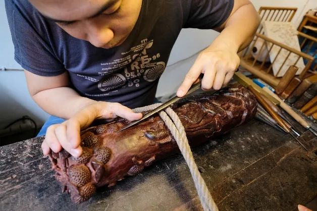 半年前,他接到一笔订单,其原料是一件上好檀木,十分珍贵,对工艺要求近乎苛刻的他从不随意动刀,但在灵感闪过脑海的那一刻,也从不放过,就算是半夜躺在床上,也要起身拿起刻刀冲向工作台。