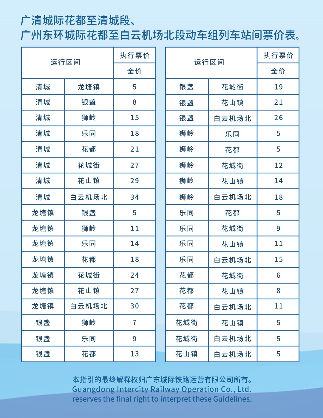 广东城际运营公司车站服务中心总经理朱小山向记者介绍道,广清城际、广州东环城际单程全价票最高票价为34元,为清城站至白云机场北站;站间最低票价为5元,分别为清城至龙塘镇、龙塘镇至银盏、狮岭至乐同、狮岭至花都、乐同至花都、花城街至花山镇、花城街至白云机场北、花山镇至白云机场北等区间。