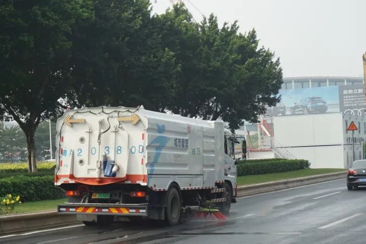 上午10时许,陈德燕驾驶着新换的扫路车从会展西路来到了琶洲大道东,车辆底部的两个地刷正在高速转动,吸附道路上的杂物,后面的喷头同步运转降尘。只见车辆过后,道路十分干净。