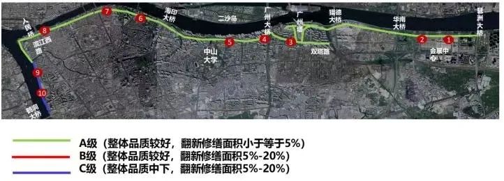 该路线长17.6公里,沿珠江北侧呈东西走向,西起鹤洞大桥东至科韵路,环岛路(洲头咀公园-海珠涌大桥)路面及人行道崭新,路况良好。除太古仓路外,全线机动车道品质较好,局部有小面积修补和破损痕迹需进行修复,慢行系统除滨江东路段慢行道部分未进行铺装提升及滨江中路、滨江西路段沉降导致石材大面积断裂的路段外,其余段落均已完善;城市家具及附属设施基本完善。