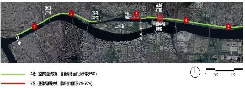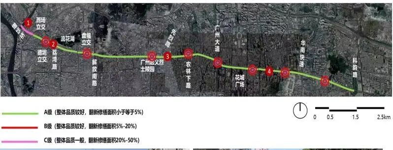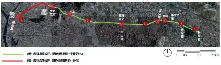 沿线经过跨线桥 7 座(西场立交南岸路跨线桥、大北立交、小北跨线桥、 区庄立交、天河立交跨线桥、五山路跨线桥、华师跨线桥),其中南岸路跨线桥车辙发育,坑洞较多,桥面修补痕迹明显,沥青铺装层老化,颜色深浅交错,广园路交叉口附近正在进行隧道施工建议本次实施不予考虑。此外,西场立交至省客运站路段未品质化提升,整体风貌一般。