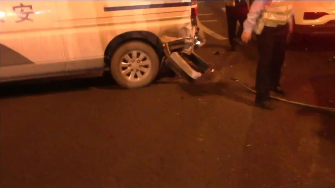 见民警走近,白色轿车突然快速往后倒车,并与后面车辆发生碰撞。不顾现场民警的大声警告,这辆白色轿车继续加速往前冲,期间先后与四辆社会车辆、三辆警车发生激烈碰撞,在轮胎被阻车钉扎破的情况下,仍加速逃离现场。