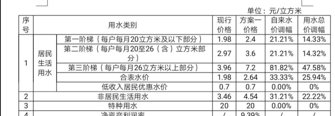 非居民生活用水收费标准调整为4.54元/立方米,特种用水价格维持20元/立方米。