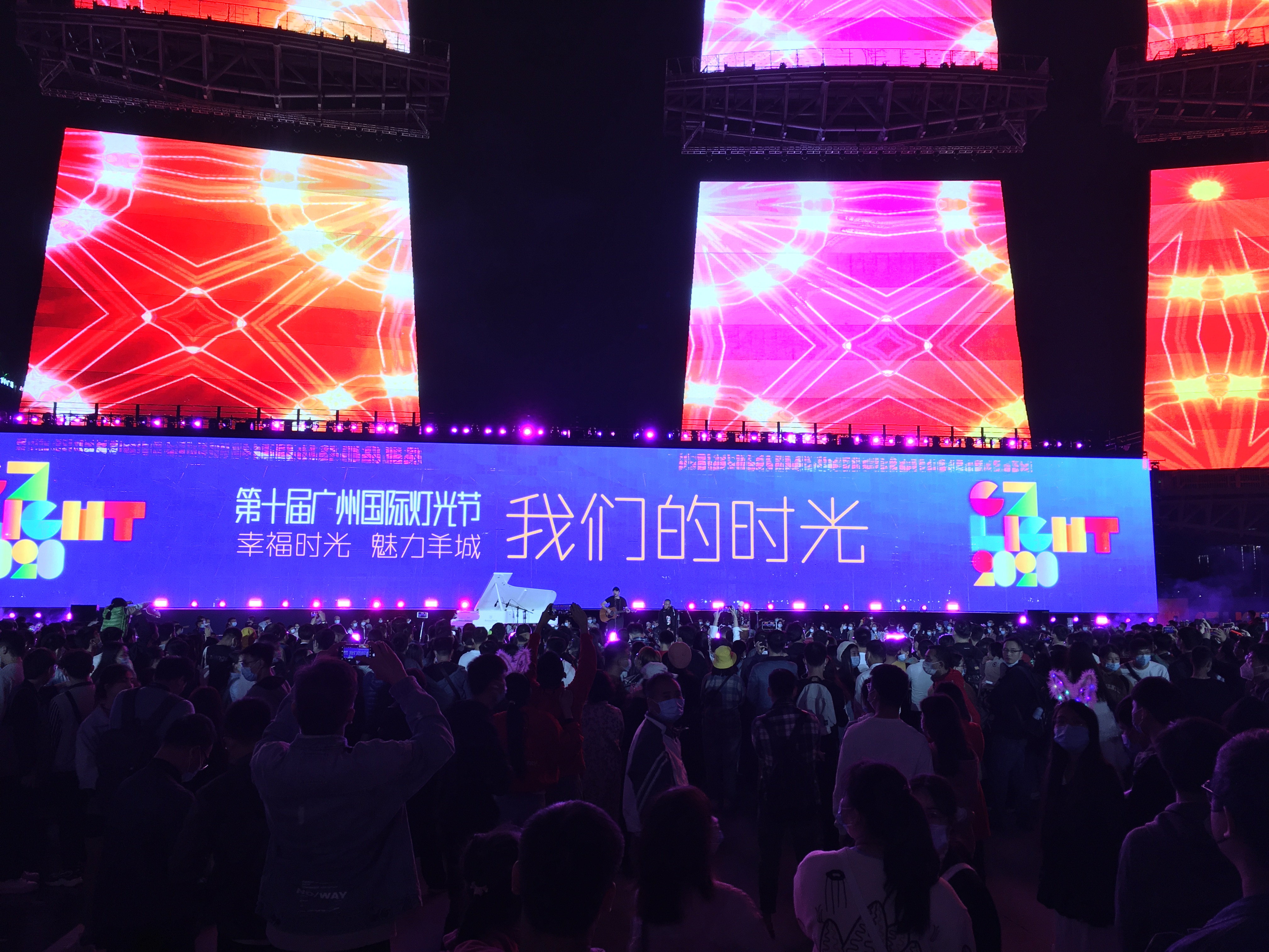 2020第十届广州国际灯光节下周二即将闭幕,本周末,海心沙主会场迎来了灯光节闭幕前的一个高峰。不少灯光节的忠实粉丝,趁着周末,来一睹灯光节的风采。为了回馈市民的厚爱,广州市政府新闻办举办的“十年华彩,璀璨花城”广州国际灯光节十周年特别系列活动在周末上演。28日晚的“十年华彩—民谣新力量”活动中,知名民谣乐队田园牧歌和玩具船长,将海心沙化身民谣音乐的海洋。