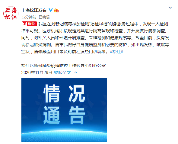 据松江区新冠肺炎疫情防控工作领导小组办公室发布的信息,松江区在对新冠病毒核酸检测“愿检尽检”对象服务过程中,发现一人检测结果可疑。医疗机构即按规定对其进行隔离留观和检查,并开展流行病学调查。同时,对相关人员和环境开展排查、采样检测和健康观察等。截至目前,没有发现新冠肺炎病例。请市民做好自身健康监测和必要的防护,如出现发热、咳嗽等症状,请佩戴医用口罩及时前往发热门诊就诊。