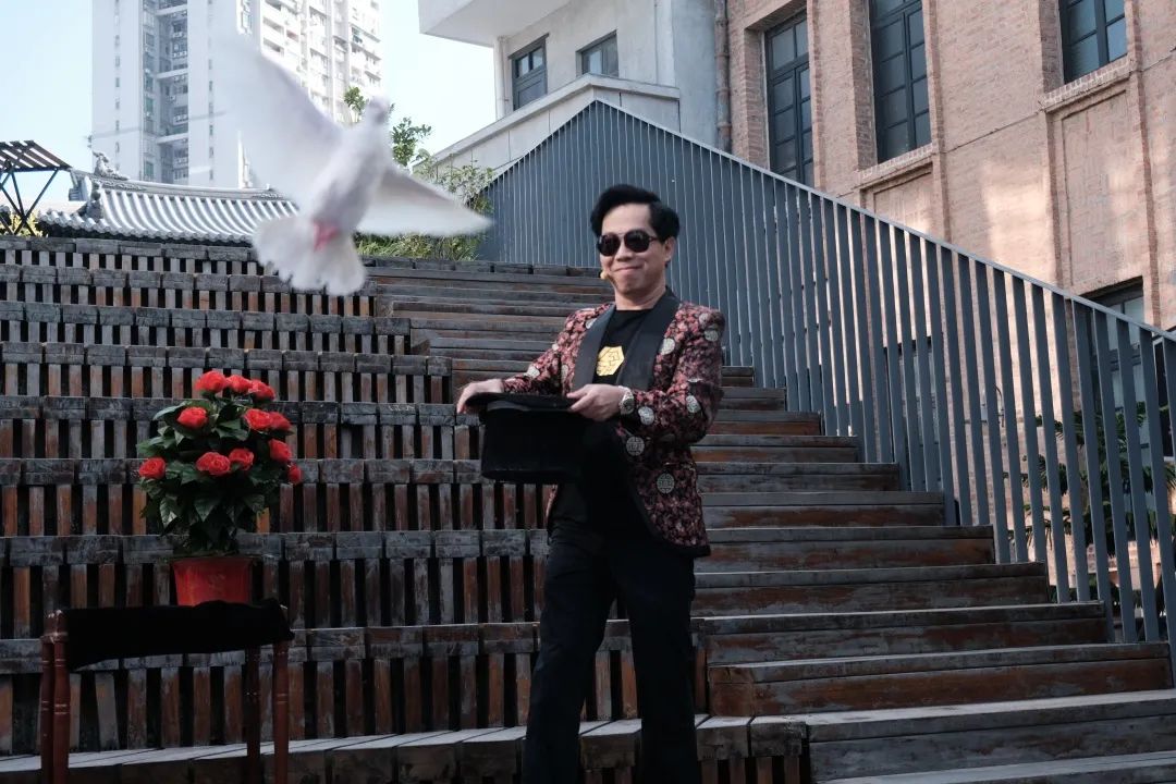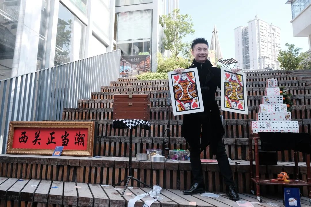 在乡愁广场前,“西关大少”装扮的魔术师利用出神入化的扑克魔术,把充满岭南谚语元素的扑克牌“洒”向观众,让现场市民感受岭南文化与现代魔术的趣味碰撞。