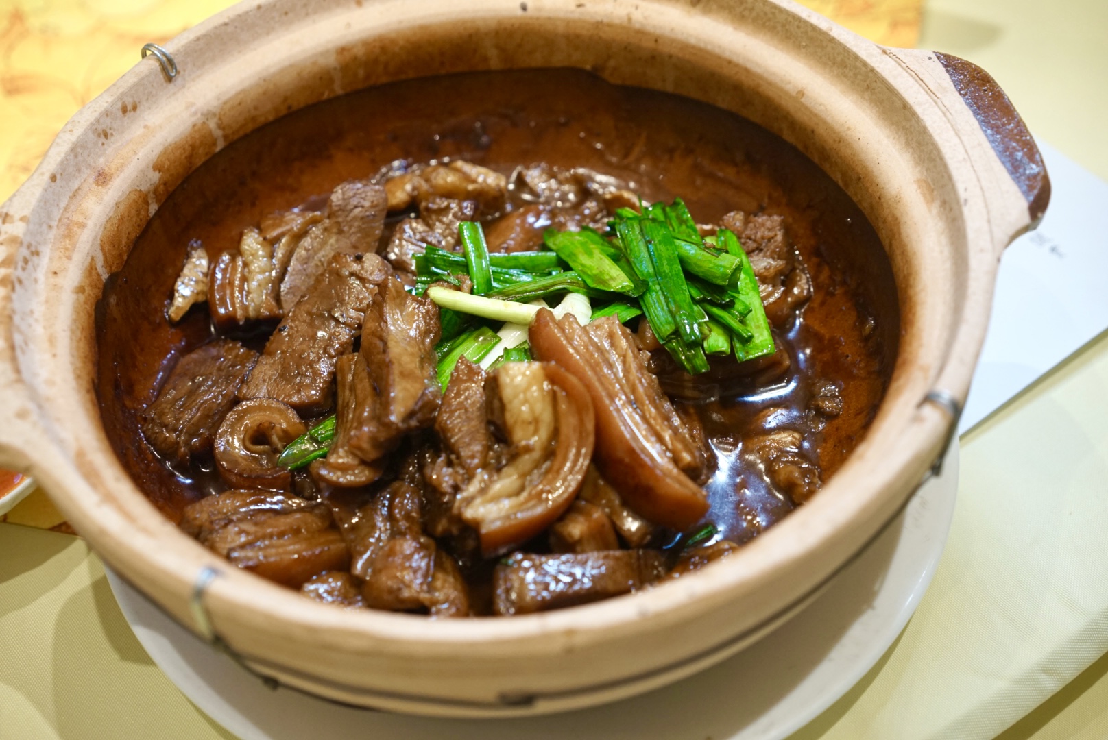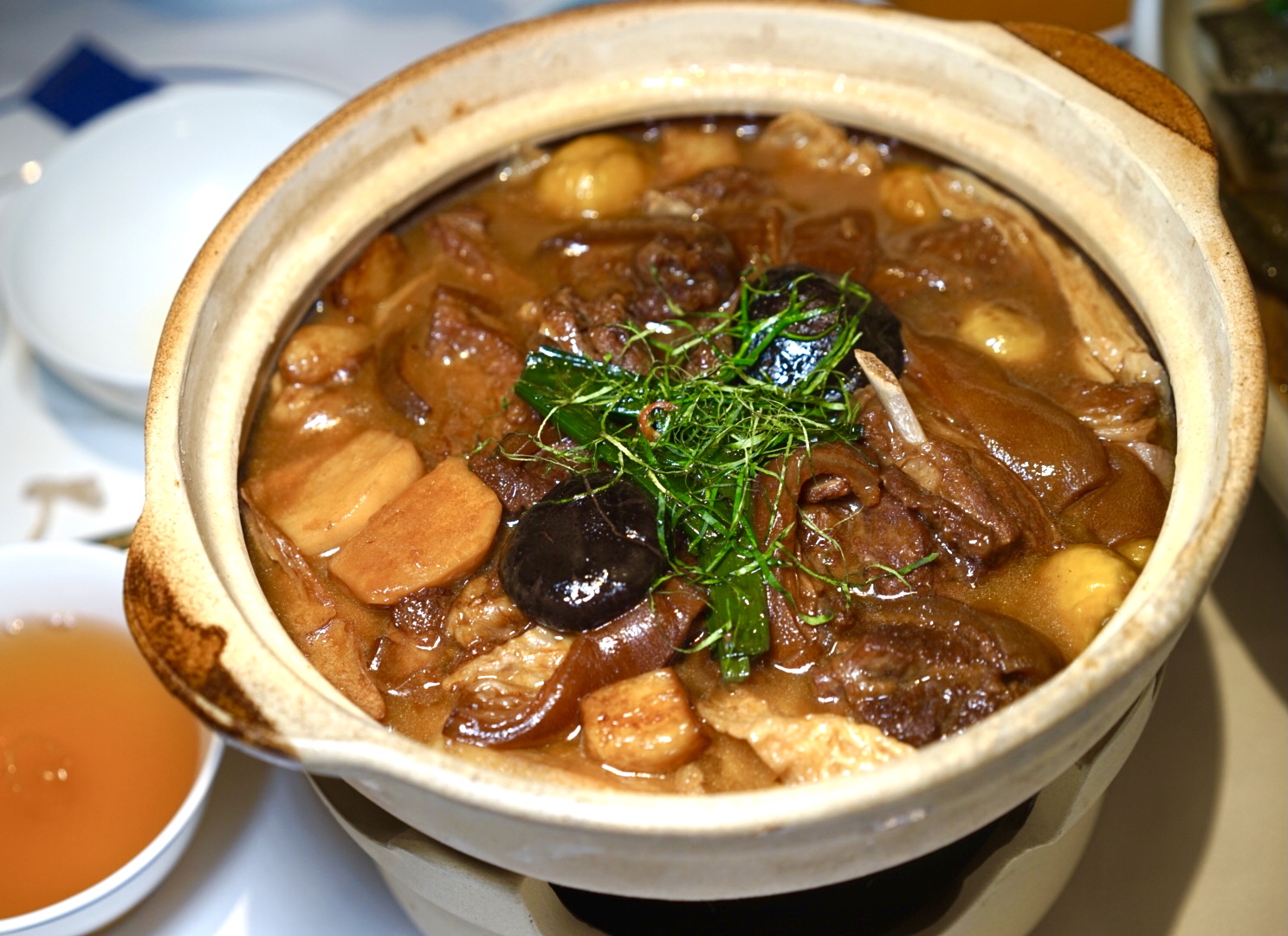 秘制羊肉煲特点在于酱香味浓郁,其汤底是用Crystal的太爷留下来的天鲜汤秘方来熬制,所谓“天鲜”指鱼羊之鲜。鱼所用的是生鱼骨,羊则是羊骨,二者煎香过以后,再加红萝卜、马蹄与药材熬制,最终出得来奶白色的浓汤。秘制羊肉煲可以分别选择羊肉、羊腩、羊腩排和羊颈4个部位,这4个煲各有风味,随君所好。每一件都切得足够厚,才能锁住肉汁。