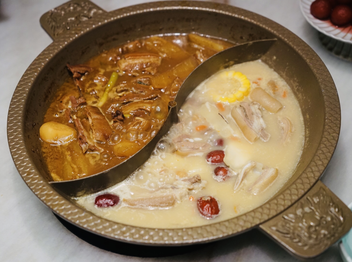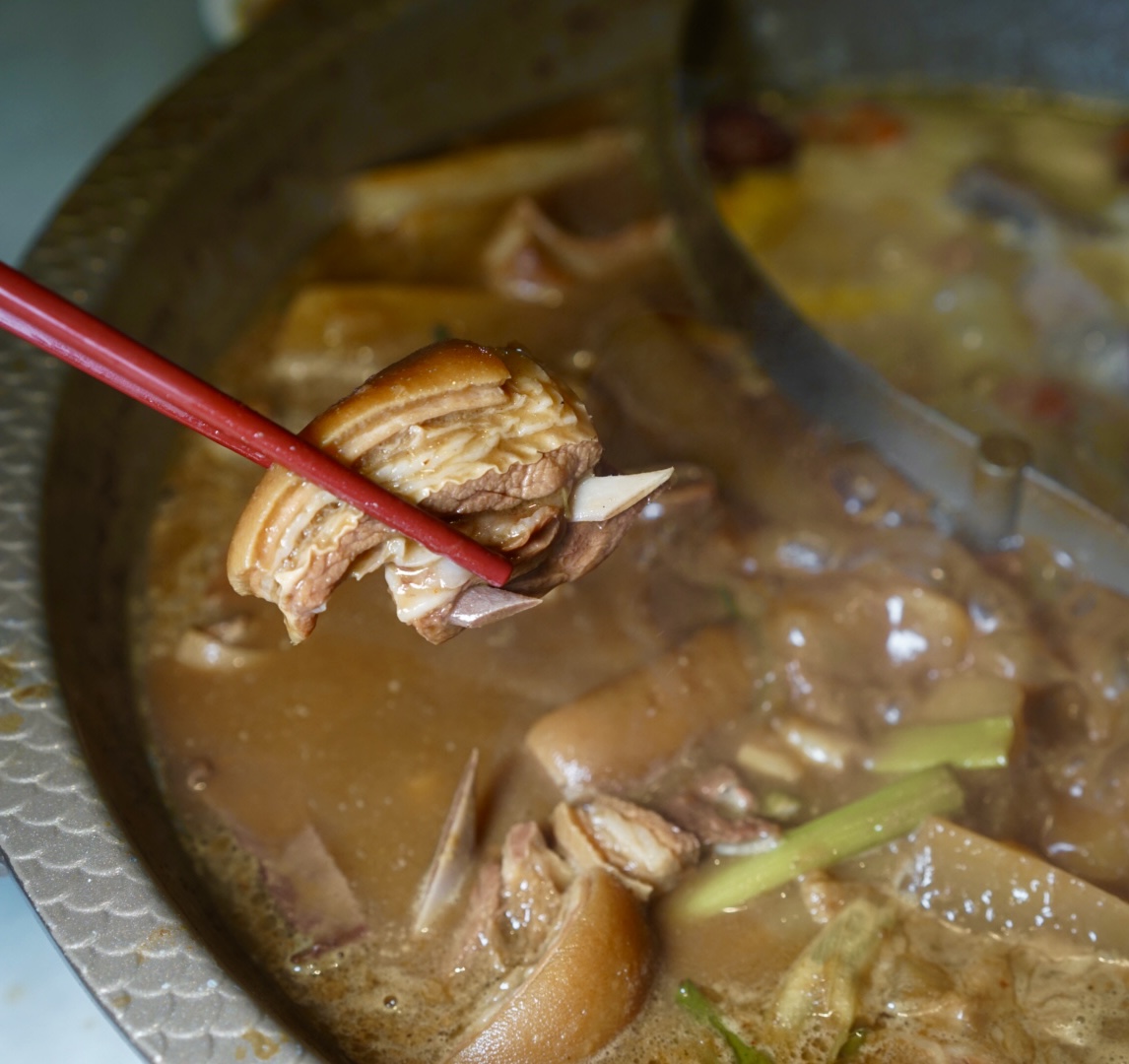 年轻的主理人Crystal告诉记者,“鸳鸯羊”的灵感源自于冬天的“鸳鸯火锅”。鸳鸯火锅一边是热火朝天的辣,一边是清心寡欲的雅,两种呈对比式的风味融汇于一锅中,给人两种不同的用餐体验。“鸳鸯羊”同理,一边是传统的秘制羊肉煲,另一边是清汤羊,二者形成一浓一清的鲜明对比口味。“有时一家人来吃饭,老公要吃浓郁的酱香味,老婆却要吃清淡的羊汤”,重口难调,总有一方留下遗憾。“鸳鸯羊”恰好能解决这个世纪难题,这两款都是受欢迎度极高的单品,这个组合恰能满足两种主要需求。清汤羊的汤底是用加了当归、党参、枸杞、红枣和羊骨来熬制而成的。品清汤羊时,先饮一口汤,再吃羊肉。