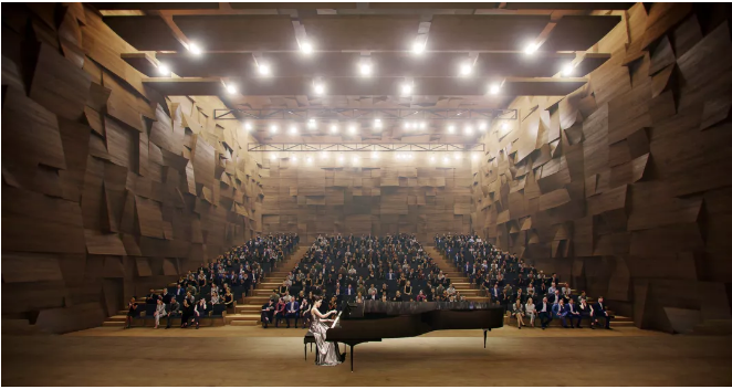 校园的四个主要功能区域分别布置在各自的山丘上,内庭院沿河布置,同时在东西两侧完全打开,与周边两个港中大校区相对应。建筑上,校园基于清晰的网格布局,有效地利用空间和结构。内庭院立面主要采用玻璃和哑光白色陶瓷。沿街外立面的弯曲变化从天际线和远景上以和谐的方式将建筑融入到整个景观之中。郁郁葱葱的山川森林和清澈的湖水为音乐学院提供了一个和谐的自然周边环境,同时也是理想的音乐环境。基于周边自然环境元素设计的校园本身就是一处风景。