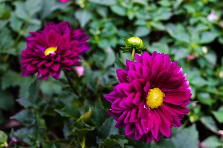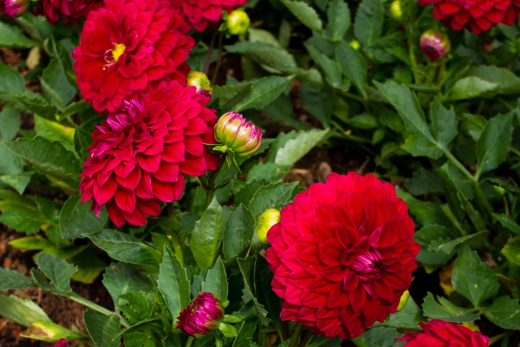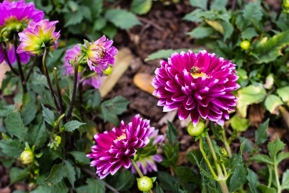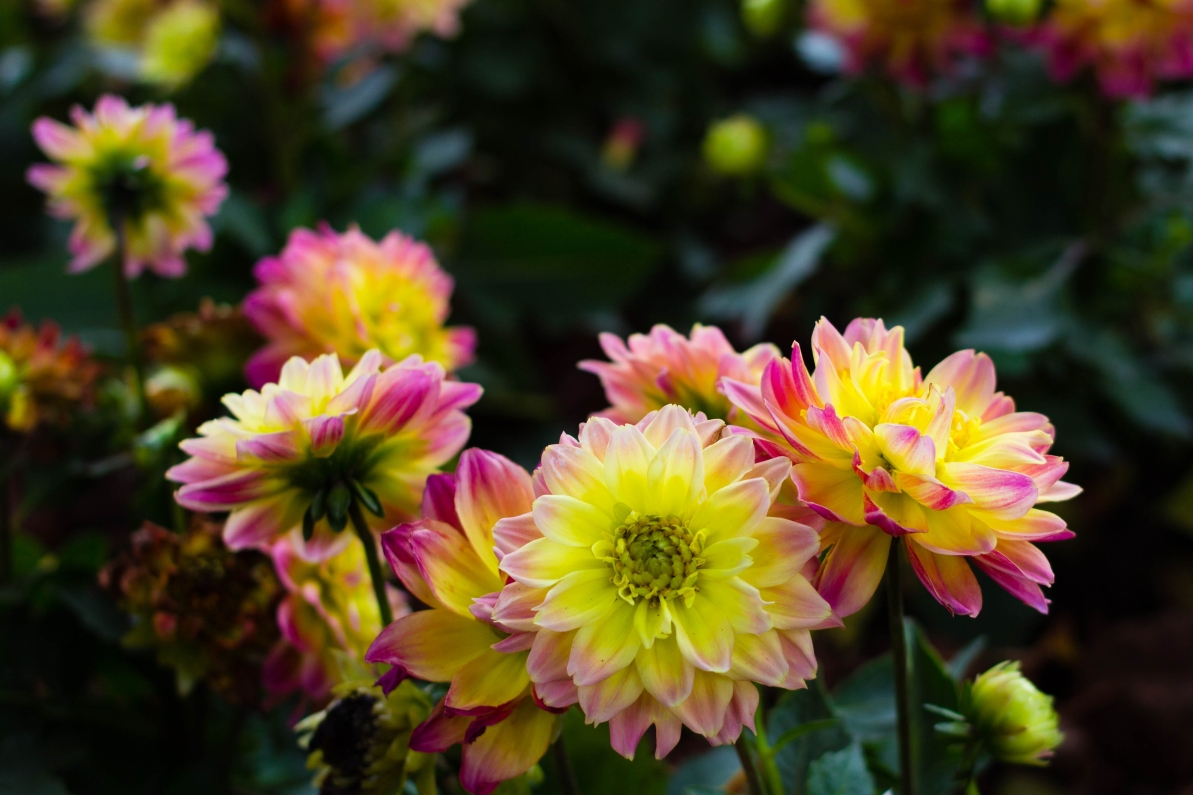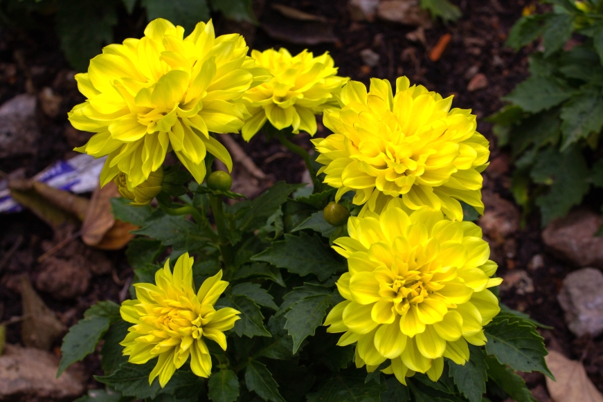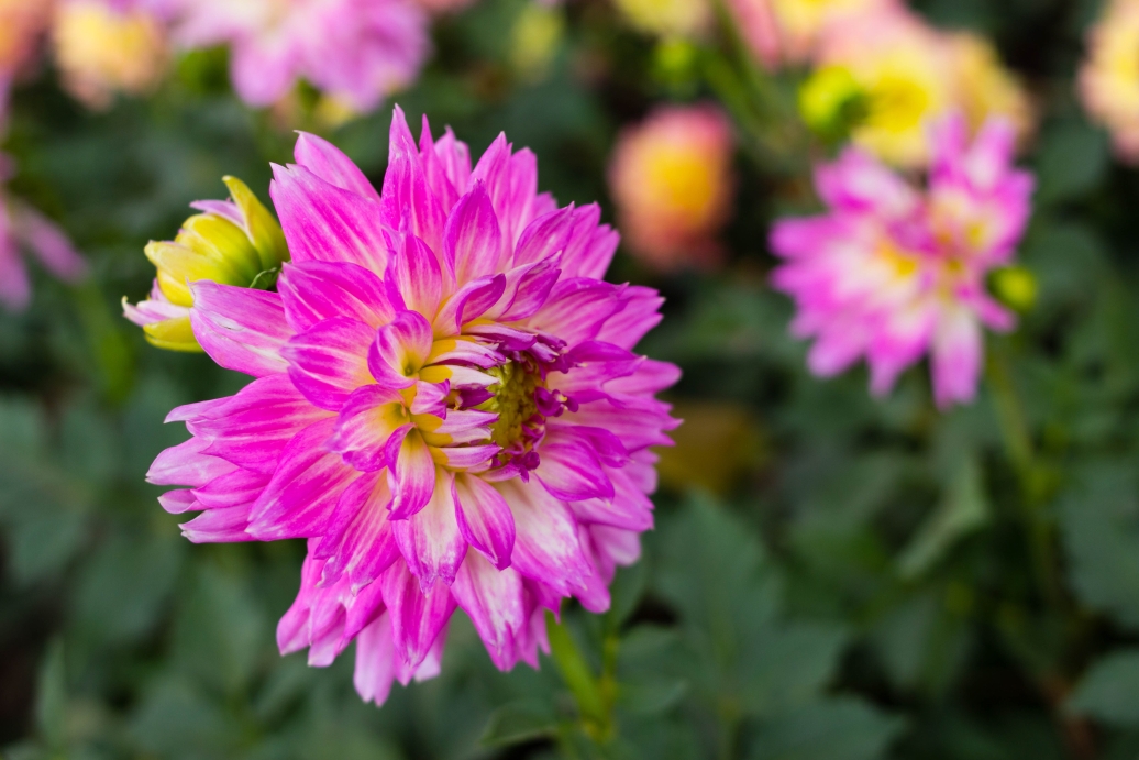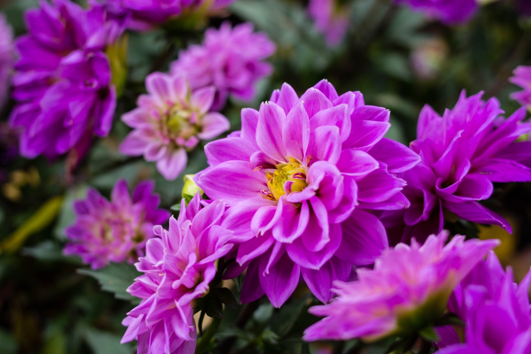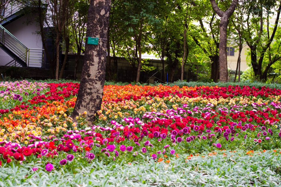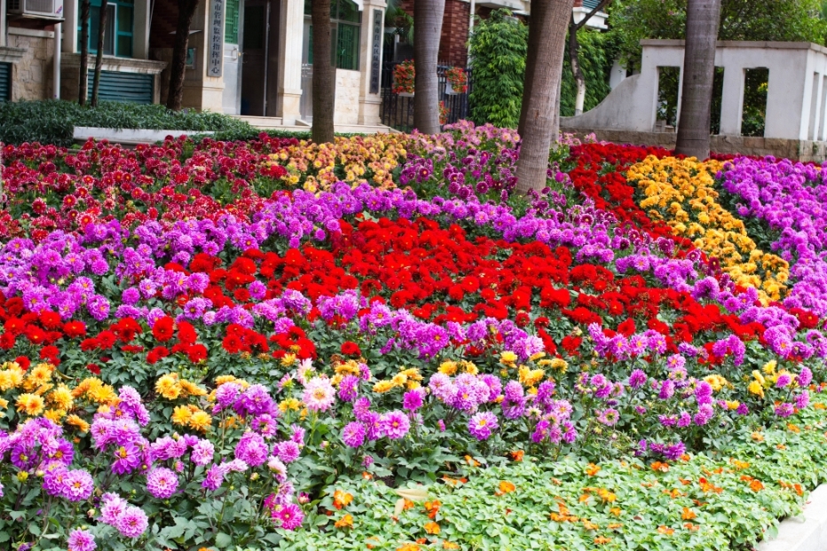 从公园正门一进门,就看到一大片绚烂夺目的小丽花,有亮黄色、缤纷紫、鎏金色等。走近细看,小丽花仅有几十厘米高,植株直立挺拔,花型多样,花径约为10厘米,花型有菊形、莲形、芍药形、重瓣波斯菊花型、莲座花型等,花瓣排列得整整齐齐,花色丰富多彩。
