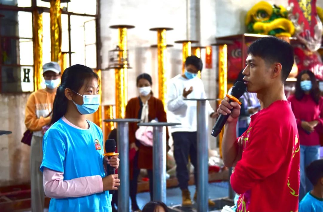 龙狮团主教练陈志彬 一一解答了小记者们的问题。番禺区民俗文化专家梁谋也来到小记者现场,从番禺龙狮起源,南北龙狮特色,龙狮故事等几方面,为小记者上了一堂生动的龙狮文化课,同时,梁谋鼓励小朋友们,作为一名小记者,要学习、了解、发扬传统文化。梁谋表示,了解传统文化,就是最好的爱国教育。在方式上,我们不能光靠空洞的说教或者刻意的灌输,更多需要的是润物细无声式的渗透。