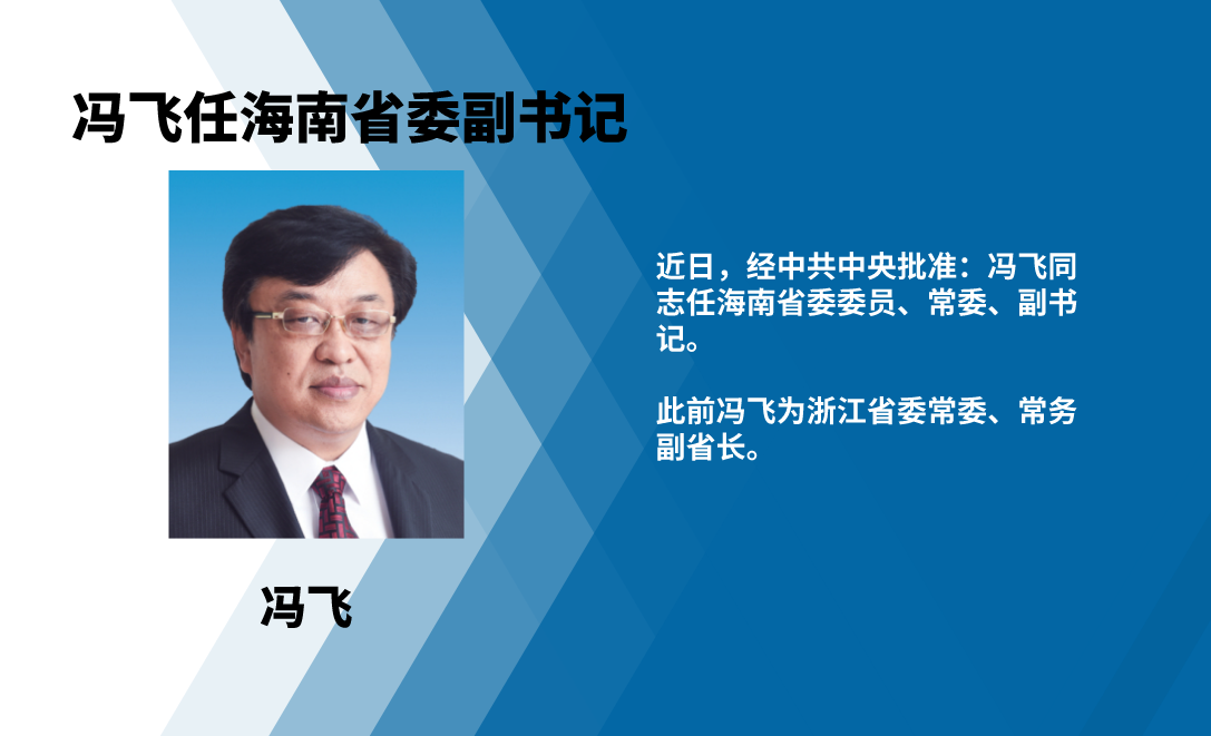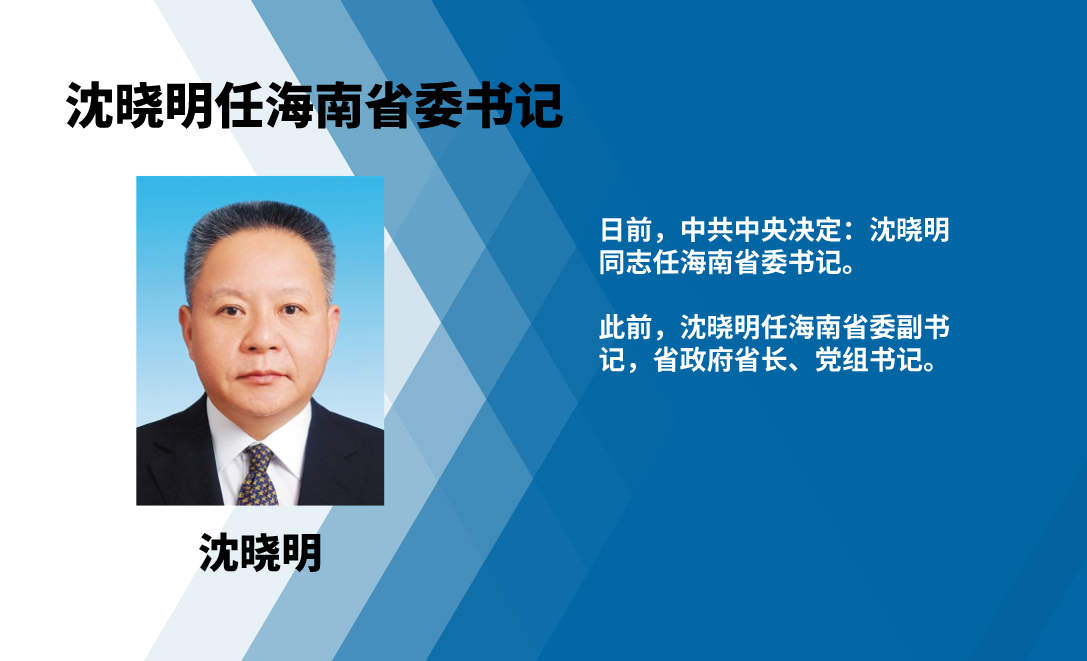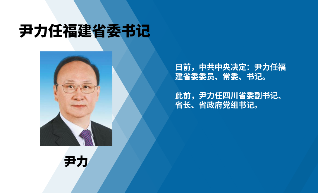 今日,媒体报道,日前,中共中央决定:尹力同志任福建省委委员、常委、书记,沈晓明同志任海南省委书记;近日,中共中央批准任振鹤出任甘肃省委副书记,黄强出任四川省委副书记,冯飞出任海南省委副书记。