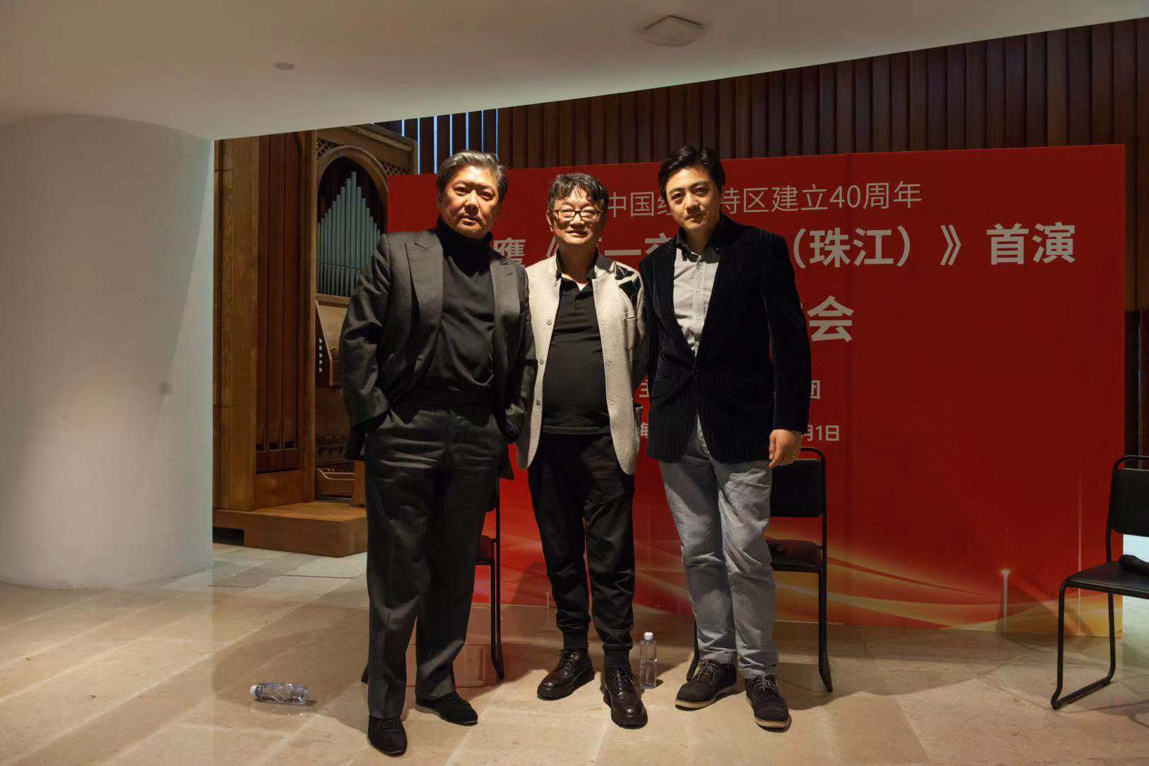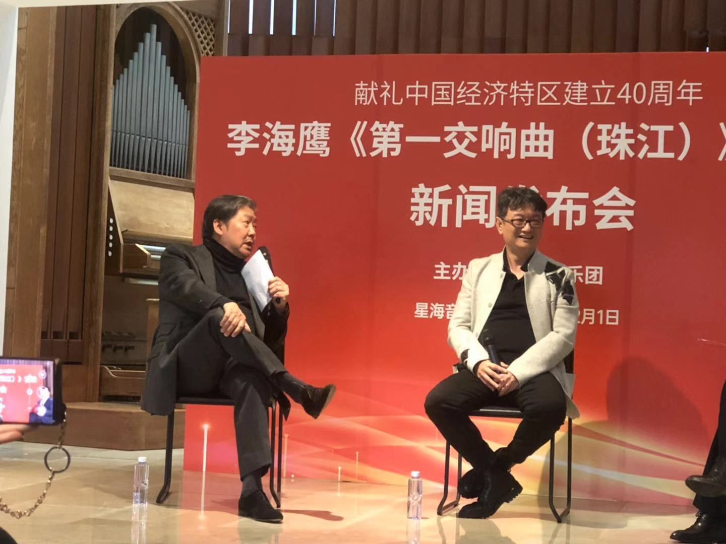 当晚演出前,《珠江交响曲》首演新闻发布会在星海音乐厅音乐空间举行,指挥家余隆和作曲家李海鹰出席了发布会。