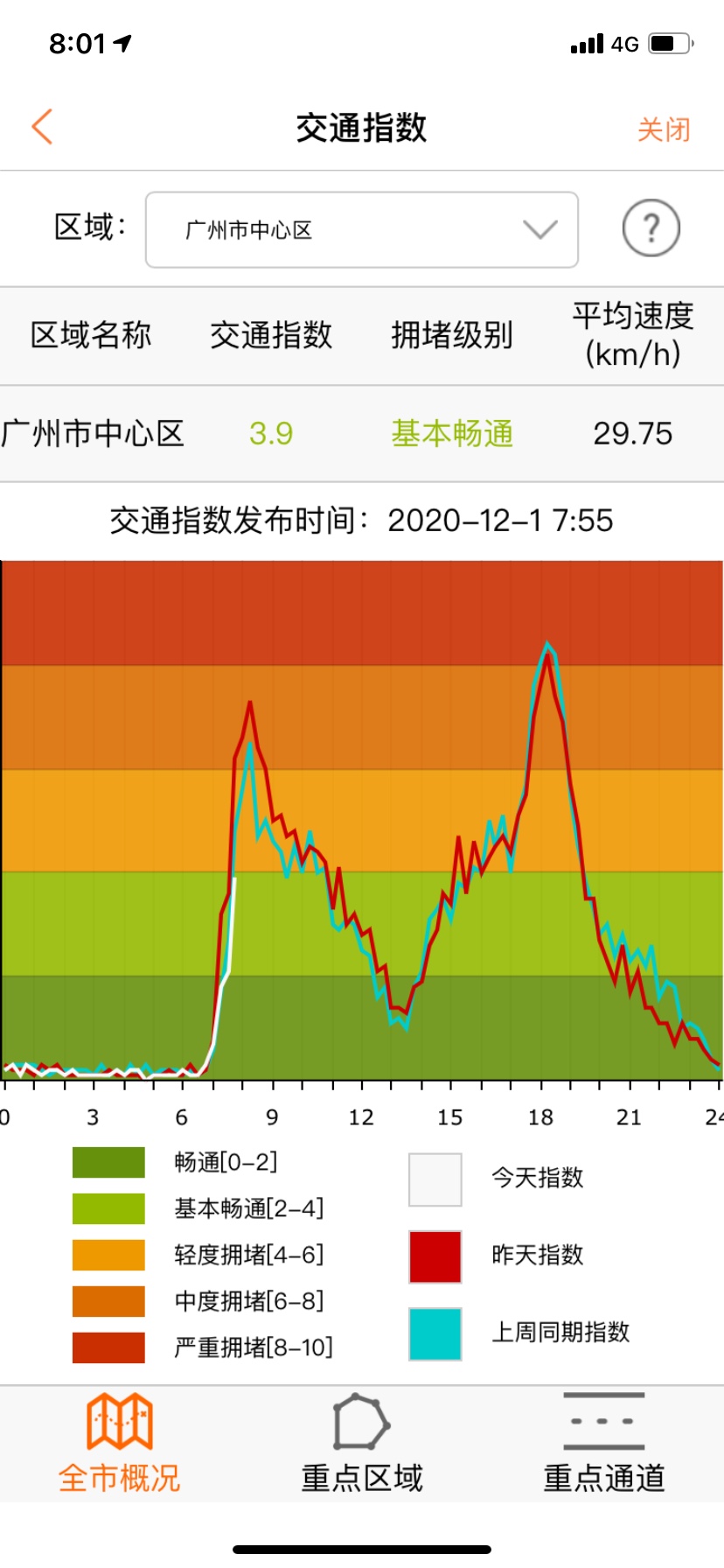 广州交通行讯通发布的交通指数中,7时55分发布的广州市中心区交通指数为3.9,拥堵级别为基本畅通,而周一指数和上周同期指数均达到了轻度拥堵级别。