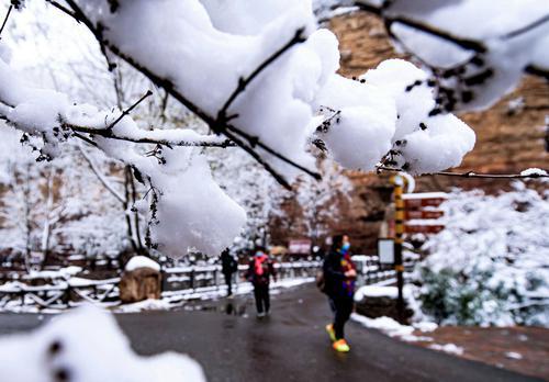 11月21日,游客在武安市七步沟景区观赏雪景。 新华社记者 王晓 摄新一股冷空气启程 近20个省会级城市明后天气温或创新低