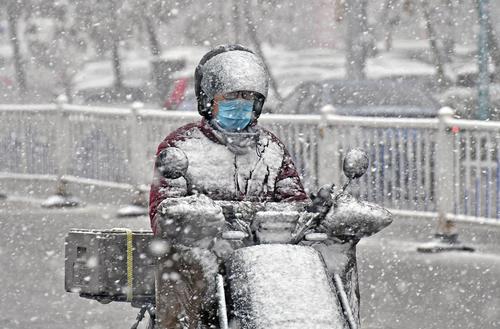 11月28日,一名骑行者在山东省烟台市街头冒雪出行。新华社发(孙文潭 摄)粤北明天最低气温跌到7℃