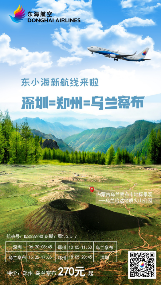 为更好地满足深圳、乌兰察布两地旅客的出行需求,优化航线网络,东海航空新增DZ6239/40“深圳-郑州-乌兰察布”航线。