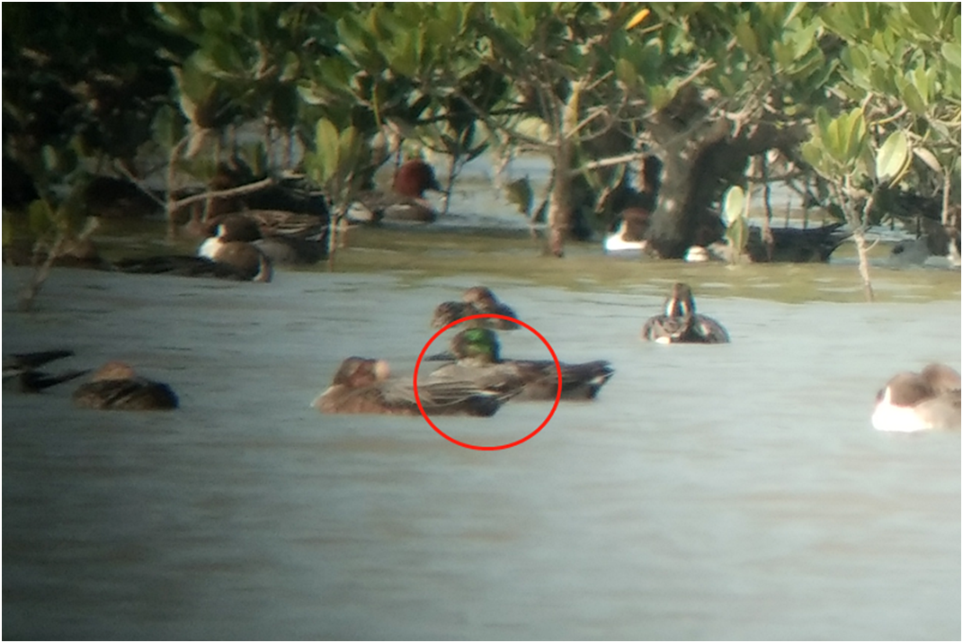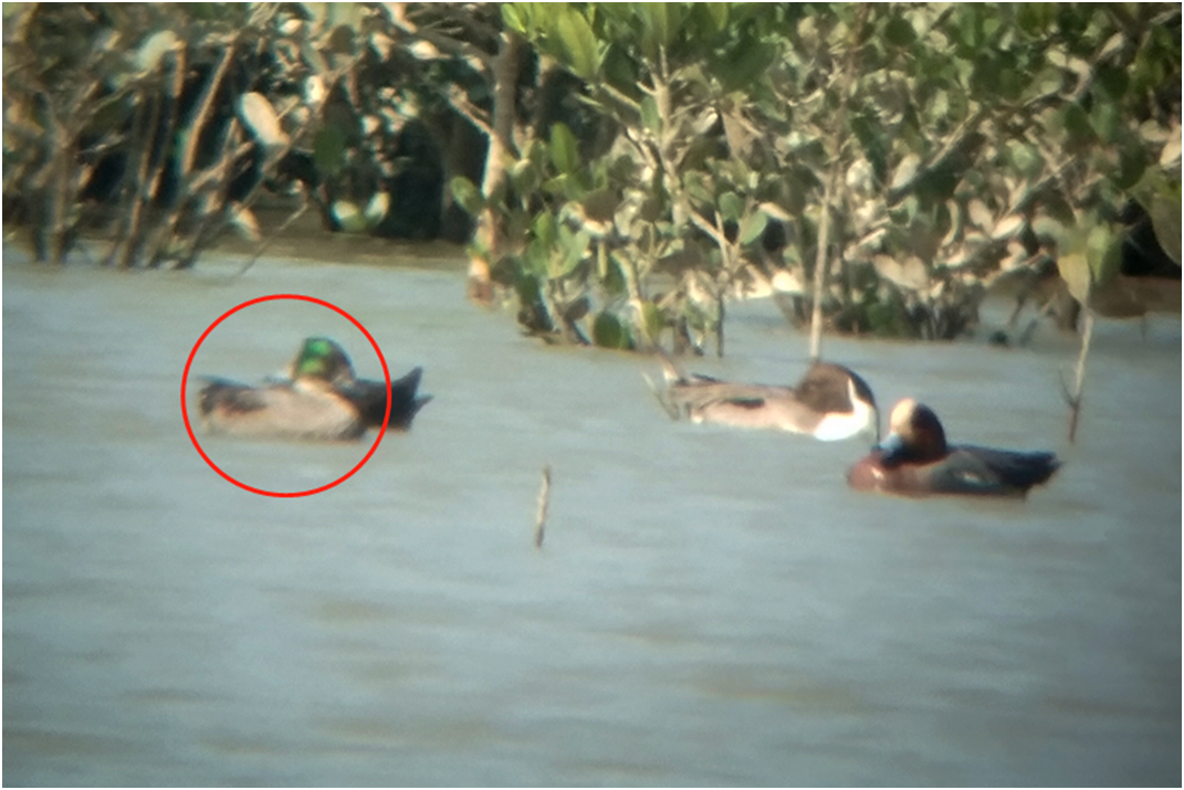 据了解,在12月1日的鸟类普查中,观测人员在福田红树林保护区的观鸟船上观测到,西边远处的红树林边沿有一群鸭类漂浮在水面上,它们在低潮时已经吃饱喝足,大多在埋头休息。经过仔细观察,在这些鸭类中,大部分是赤颈鸭和针尾鸭。不过,有一只鸭类与众不同,在阳光的照射下,头部散发出碧绿的光芒。