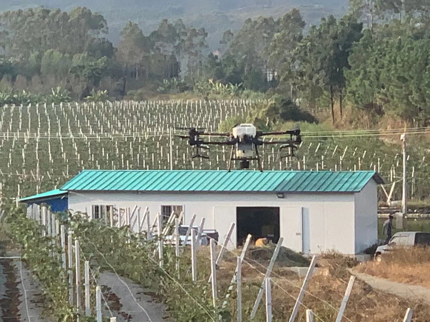 呼啸而来,在水头镇石潭村的无花果种植基地里,一架大型植保无人机正在给大棚内的无花果树均匀地施肥打药。在越秀区帮扶工作队等推动下,这近千亩的无花果基地成功落地水头镇,将为附近贫困户脱贫增收。