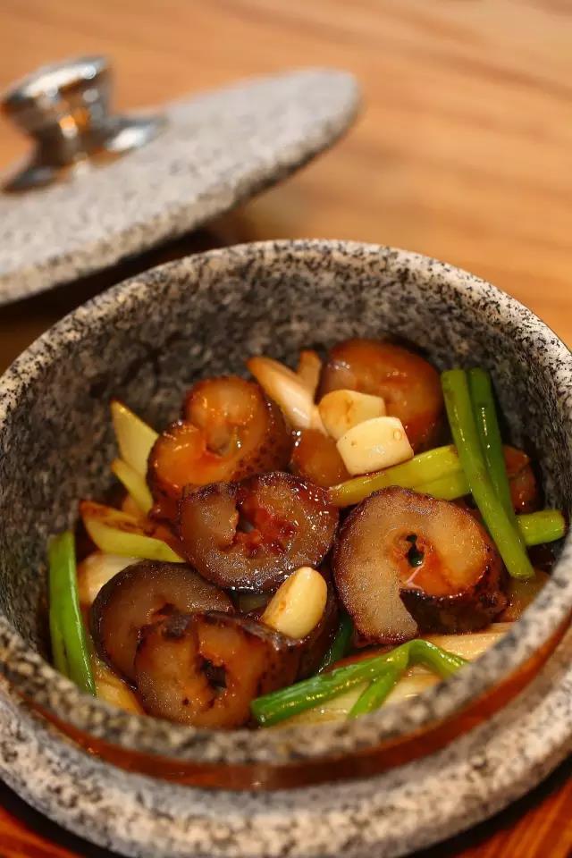将发好的海参直接切块状,搭配五花肉、京葱、蒜蓉、椒条。将五花肉切成薄片,入锅煎至两面呈金黄色。接着五花肉起锅,将其分泌出来的油捞起备用。烹煮海参时,加入蚝油、盐、糖,用慢火煨;接着下备用的猪油来爆香海参,添加蒜蓉、京葱、啫酱等调味,和海参一起啫熟即可上煲。