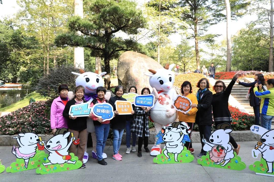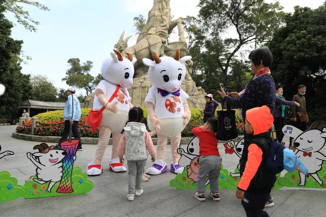 广州市民文化季吉祥物的“羊小夏”,与广州城市地标五羊石像的合影。