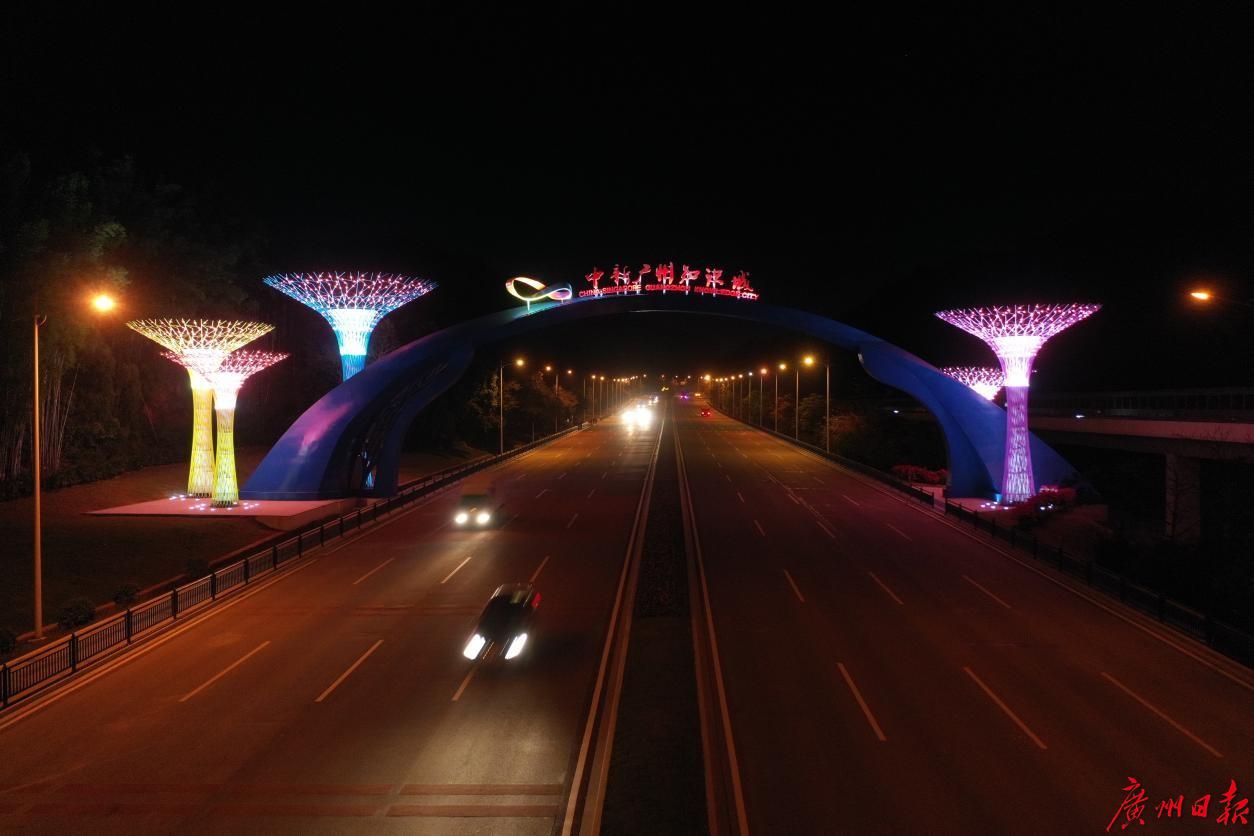 展现中新合作广州成果。拱门两侧的五株“智慧树”,造型融合了新加坡著名景点“超级树”和广州“小蛮腰”的形态,呈向上生长的形态,寓意中国和新加坡在广州知识城的合作成果多、前景广阔。